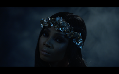 Directed by Kemi Adetiba, On Becoming is a graceful yet haunting 3-minute clip shot in a pitch-black room. Suddenly we hear the strike of a match which reveals a hand lighting a candle. The Candle is lifted to illuminate a wall plastered with salacious newspaper headlines. Toke is then seen standing and brushing her hair in stoic fashion, without emotion on her face.
